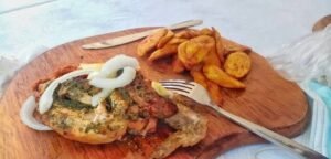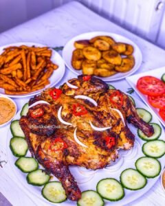 Poulet roit au frites de plantain et pomme